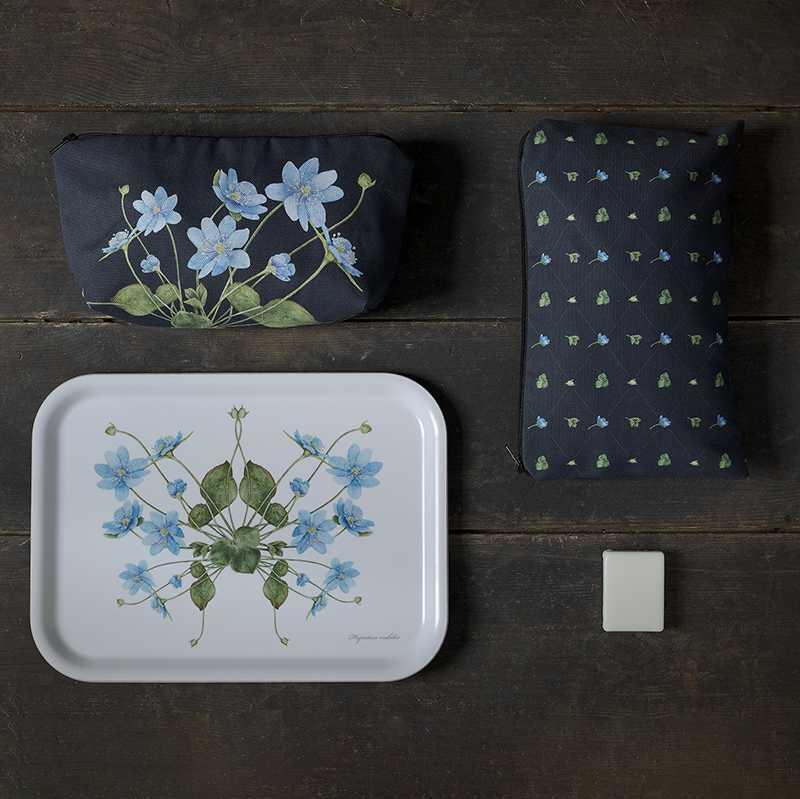 Smuk serveringsbakke med motiv af blå anemone, illustreret af Marianne Scheel.