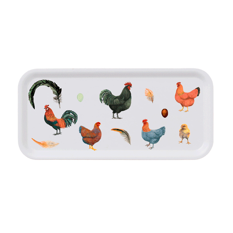 Bakke med motiv af farverige høns, haner, kyllinger, æg og fjer. Illustreret af Daniel Haase.