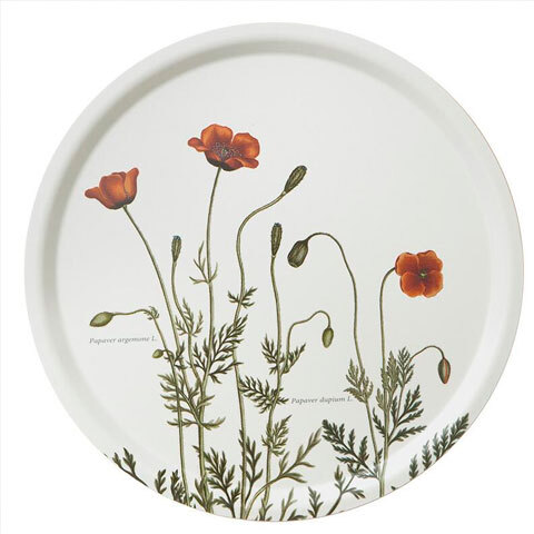 Bæredygtig rund serveringsbakke med motiv af Flora Danica's røde Køllevalmue.