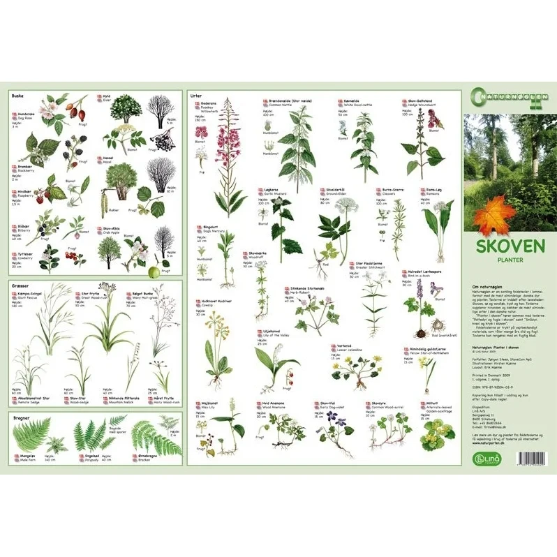 På foldetavlens ene side vises 22 af de mest almindelige træer illustreret både med og uden blade og med nærbilleder af blade, frugter og blomster. Desuden er der en nøgle til bestemmelse af bladets form og indskæringer. På foldetavlens anden side findes buske, græsser, bregner og urter, ligeledes med blomster, frugter og størrelse på planten. Navne på dansk og engelsk.