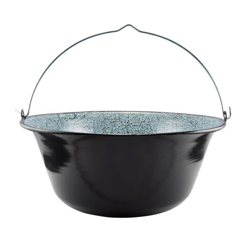 Bålgryde med blå emalje indvendig og sort emalje udvendig.