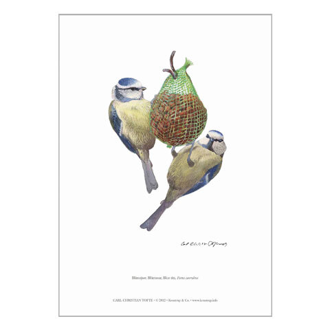 Motiv fra vinterens fugle i haven, hvor to blåmejser spiser peanuts.