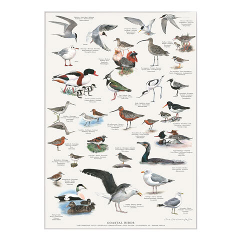 Ornitolog Carl Christian Tofte har på denne plakat illustreret 28 kystfugle. Motiverne findes også på de kvadratiske til-og-fra kort.