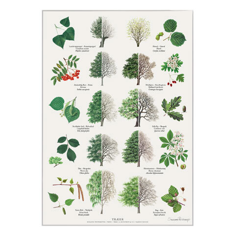 I Danmark har vi flotte stedsegrønne og løvfældende træer. Nogle er små mens andre er store. De danske løvtræer er på denne plakat smukt illustreret i træernes sommer- og vinterdragt.