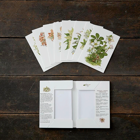 8 forskellige dobbeltkort med kuverter i gave-emballage. Format 10,5 x 15 cm, hvid C6 kuvert.