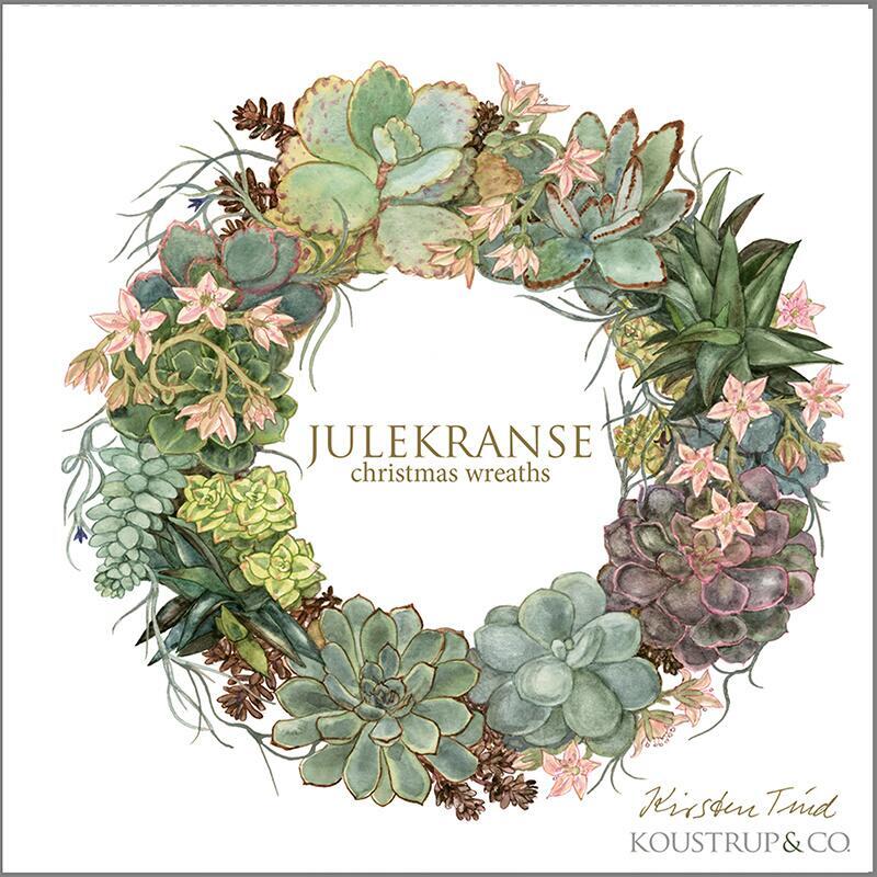 Kvadratisk kortmappe med moderne og stemningsfulde julekranse illustreret af Kirsten Tind, som på smuk vis har sammensat farver og former, der giver en unik krans hver især.