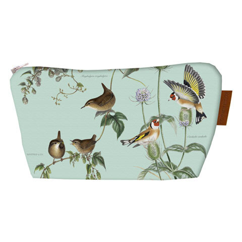 Pungen er mintgrøn med forskellige motiver af havens fugle. Med hvidt inderfoer.
