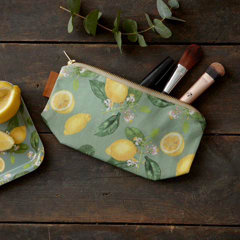 Pungen er grøn med friske gule citroner. Grønt og hvidt mønstret inderfoer. Kosmetiktasken har metallynlås, som gør tasken mere holdbar.