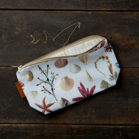 Pungen er lysblå med muslinger, skaller, tang og smådyr fra havet. Beige inderfoer med hvide striber.