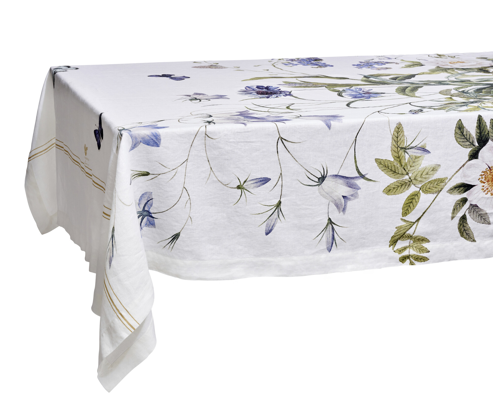 Det smukke dug med motiver af bl.a.fortryllende klokkeblomster, charmerende hvide roser og skønne sommerfugle er en del af den nye kollektion "Blue Flower Garden"