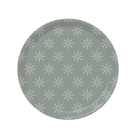 Ny rund tallerken med en diameter på 25 cm lige til at tage med på picnic. Tallerkenen har et flot motiv af små kajakker sammensat i et mønster så det ligner blomster, snefnug eller stjerner.